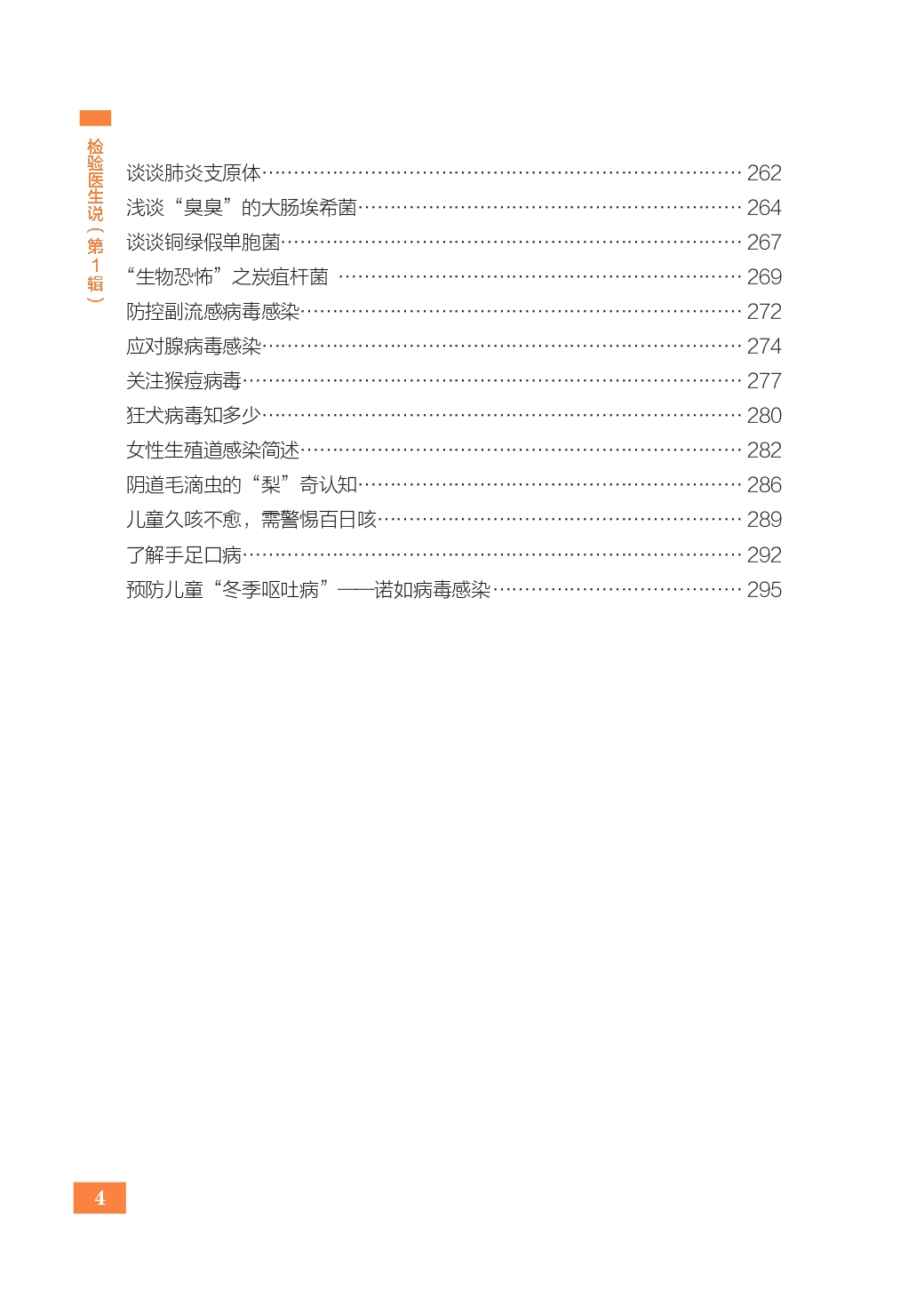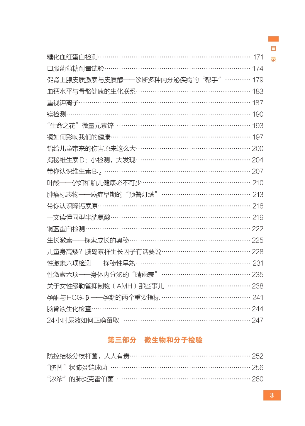 3.微生物和分子检验 系统介绍了包括细菌、肺炎支原体、病毒在内的多种常见致病微生物的传播途径、致病特点、检测等内容,旨在帮助读者了解微生物和分子检验在传染病诊断、公共卫生防控和个人健康防护中的核心作用,提升对于感染性疾病的科学认知与防范意识。此外,本部分还介绍了女性常见易感病原体和儿童常见易感病原体,便于读者查阅。